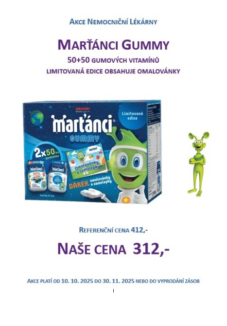 Gumové vitamíny - Marťánci GUMMY - v limitované edici s omalovánkami 50+50 ks nyní můžete zakoupit v naší nemocniční lékárně za výhodnou cenu 312,- Kč. Akce trvá od 10.10. 2025 do konce listopadu nebo do vyprodání zásob.