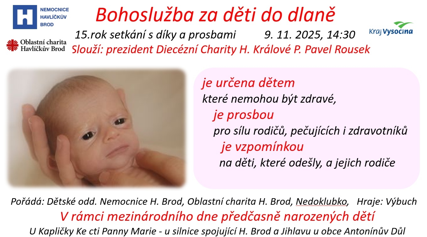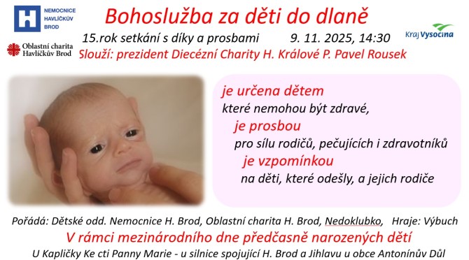 Již 15. setkání - Bohoslužba za děti do dlaně - se koná v neděli 9. listopadu 2025 od 14:30 v kapličce Panny Marie u Antonínova Dolu. Setkáním s rodinami nedonošených miminek a všech, kteří se chtějí společně s námi pomodlit za miminka, se připojujeme ke Světovému dni předčasně narozených dětí, který je vyhlášen na 17. listopadu.
