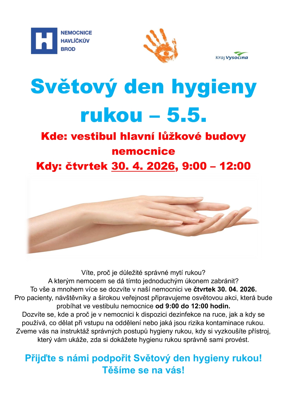 Tradiční akce - Den hygieny rukou - se u nás koná již s předstihem - ve čtvrtek 30.4.2026 od 9:00 do 12:00 ve vestibulu hlavní lůžkové budovy. Světový den hygieny rukou připadá každoročně na 5. května a je iniciativou Světové zdravotnické organizace (WHO) pod heslem „Save Lives: Clean Your Hands“. Tento den poukazuje na fakt, že správná hygiena rukou je nejúčinnější a nejlevnější prevencí šíření infekčních onemocnění