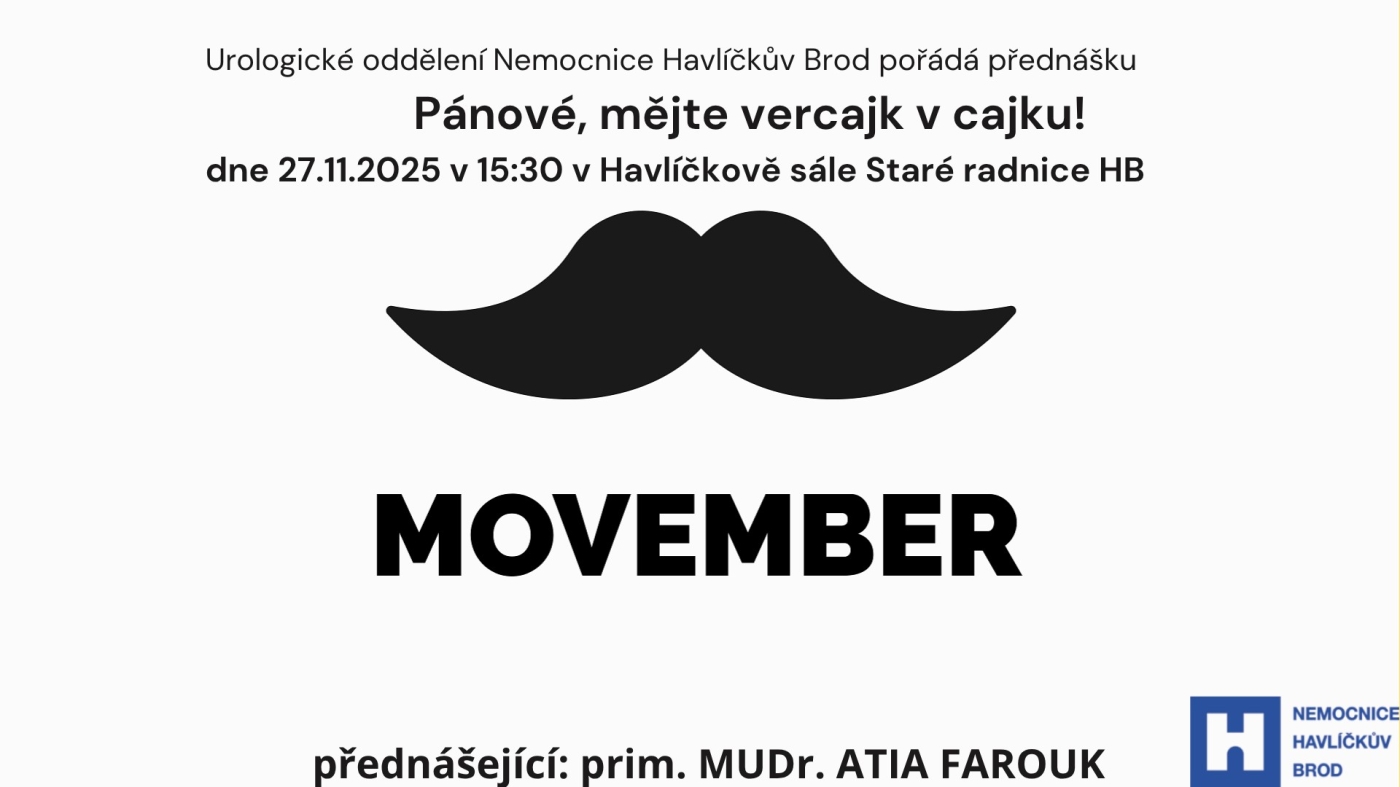 Dne 27.11.2025 pořádá naše Urologické oddělení přednášku s názvem „Pánové, mějte vercajk v cajku!“ Přednášejícím je prim. MUDr. Atia Farouk, který zaměří přednášku na seznámení veřejnosti s problematikou rakoviny prostaty a rakoviny varlat, dědičností tohoto onemocnění, její prevencí. Hovořit se bude o tom, jak probíhá vyšetření prostaty, jaké dostupné metody diagnostiky máme v brodské nemocnici k dispozici a jak probíhá léčba v případě, že je onemocnění diagnostikováno. Hlavní součástí přednášky jsou dotazy veřejnosti a diskuse k tématu. Akce se koná ve čtvrtek 27.11. od 15:30 do 16:30 v Havlíčkově sále Staré radnice HB. Akce je nejen pro muže, jakéhokoliv věku, ale i pro jejich partnerky, které mohou pomoci nejen jako psychická podpora, ale i s vyšetřením varlat.