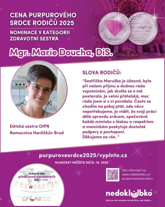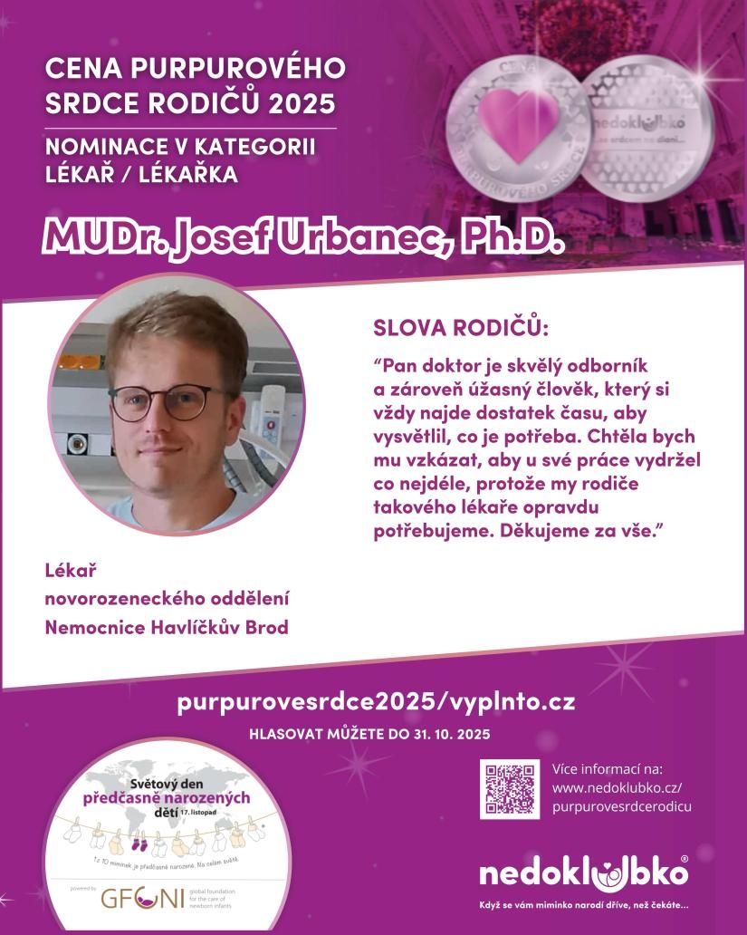 I v letošním roce byl lékař dětského oddělení, zástupce primářky, MUDr. Josef Urbanec, Ph.D., nominován rodiči na cenu Purpurové srdce, kterou uděluje Nedoklubko. Nominována byla též dětská sestřička Mgr. Marie Doucha, Dis. HLASOVAT a podpořit je oba můžete do 31.10.2025 na https://www.nedoklubko.cz/purpurovesrdcerodicu/.