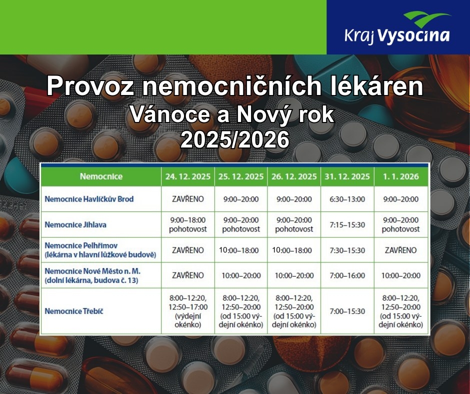 Naše nemocniční lékárna o vánočních svátcích a na Nový rok pro Vás bude otevřena takto: 24.12. ZAVŘENO, 25., 26.12.2025 a 1.1. 2026 od 9:00 do 20:00. Dne 31.12. od 6:30 do 13:00. Ostatní dny do konce roku je standardní otevírací doba jako v pracovní dny.