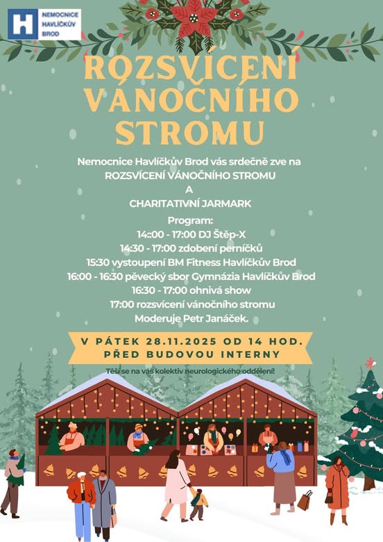 V pátek 28.11.2025 Vás zveme na naše tradiční rozsvícení vánočního stromu. Máme pro vás nachystaný program od 14:00 do 17:00 - od zdobení perníčků, po taneční vystoupení a ohnivou show.