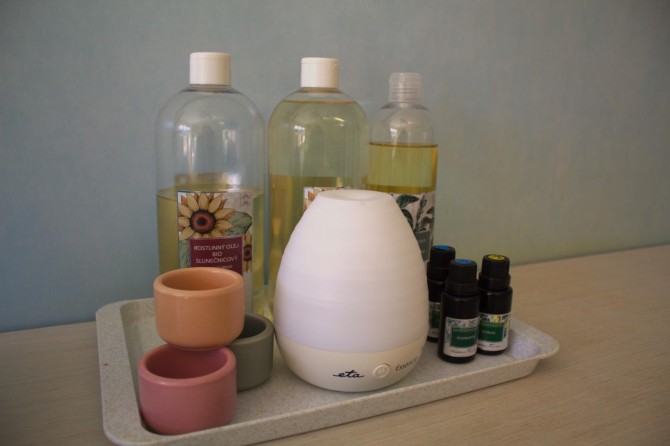 Na každém pokoji je k dispozici manželská postel, porodní pomůcky, klimatizace, sprcha a toaleta v samostatné koupelně. Vana je součástí jednoho z pokojů, na stejném pokoji je i vlastní porodnické křeslo. Během porodu jsou Vám k dispozici relaxační pomůcky – hydroterapie, madla, masážní válečky, rašelinové obklady, gymnastické míče, overbally, polohovací polštář, aromalampa, hudba dle vlastního výběru. Hojně je využívaná aromaterapie, která je prováděna zkušenými porodními asistentkami dle přání rodičky. K dispozici je též po domluvě ženská bylinná napářka (cena 150,- Kč). Klyzma doporučujeme, není však před porodem povinné.